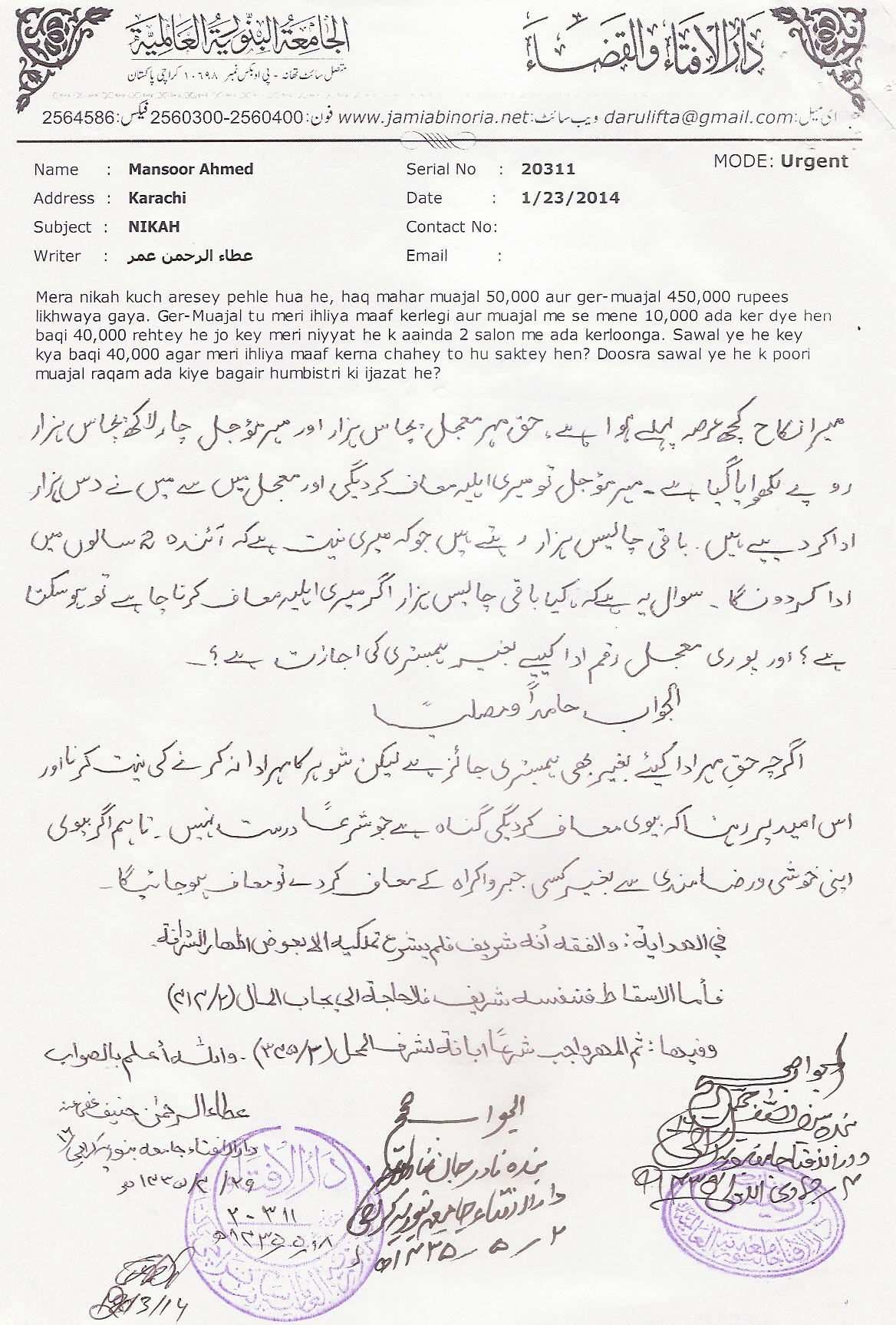 حق مہر کی ادائیگی پاک اور حلال مال سے کرنا چاہئے