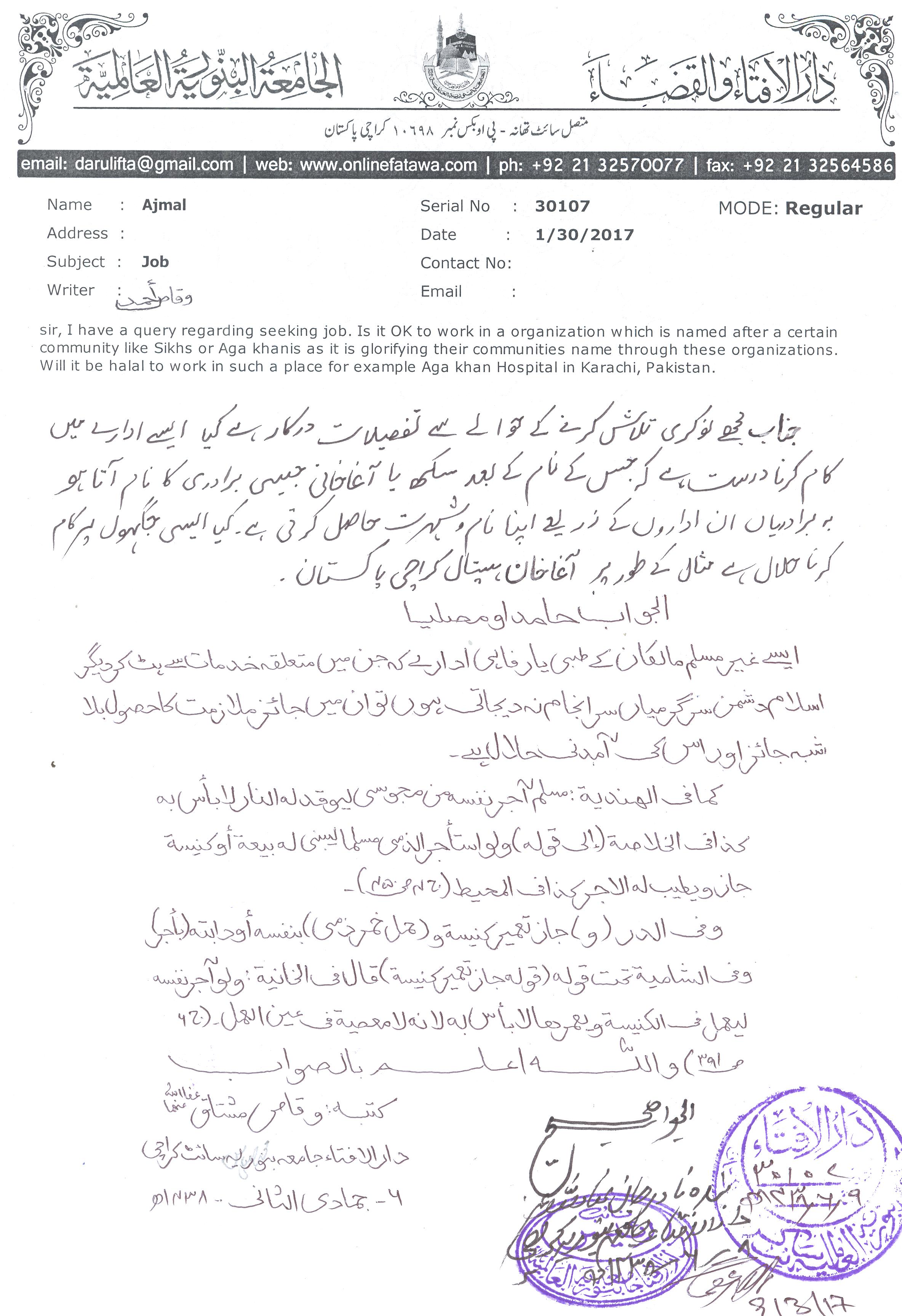 آغا خان ہسپتال یا اس جیسے غیر مسلم اداروں میں ملازمت