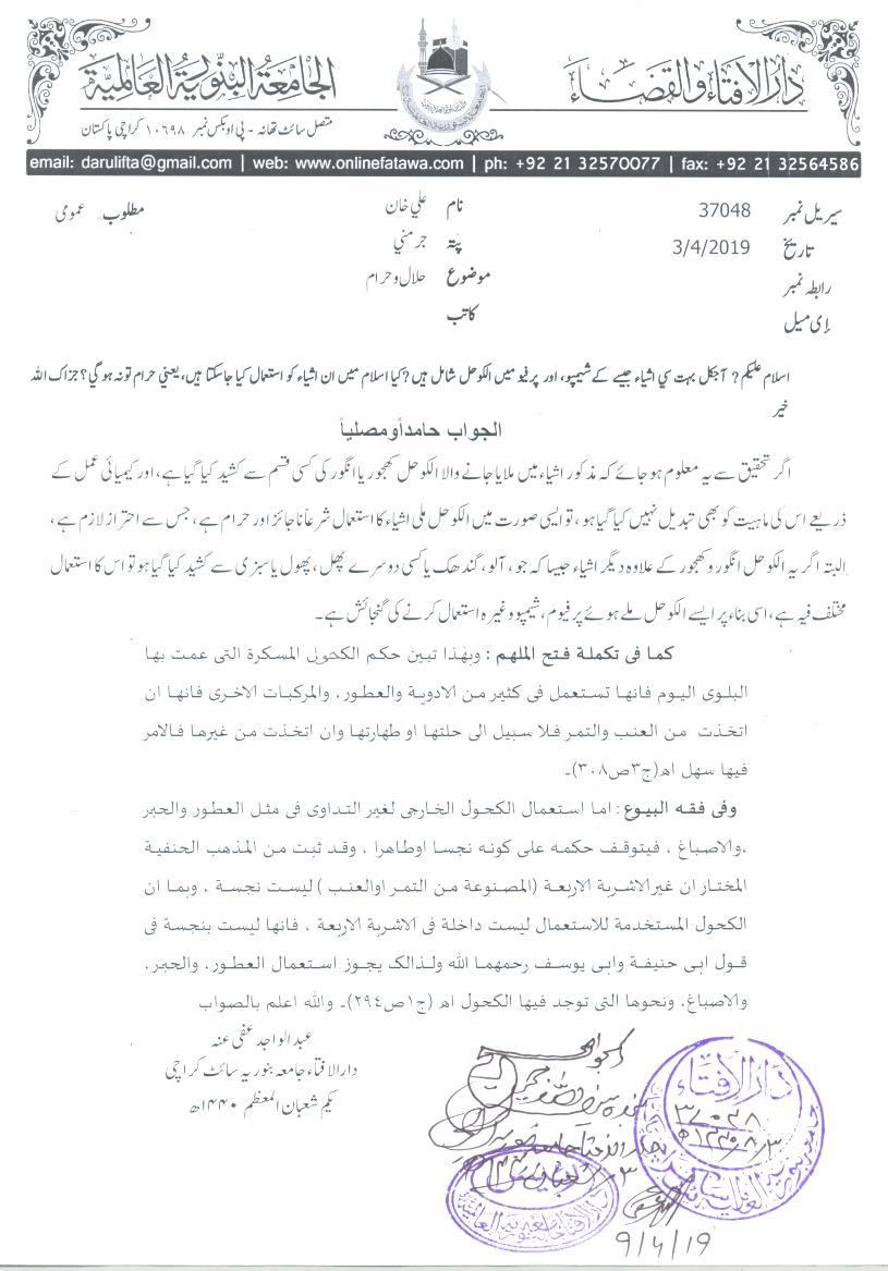 الکحل ملی اشیاء استعمال کرنے کا حکم