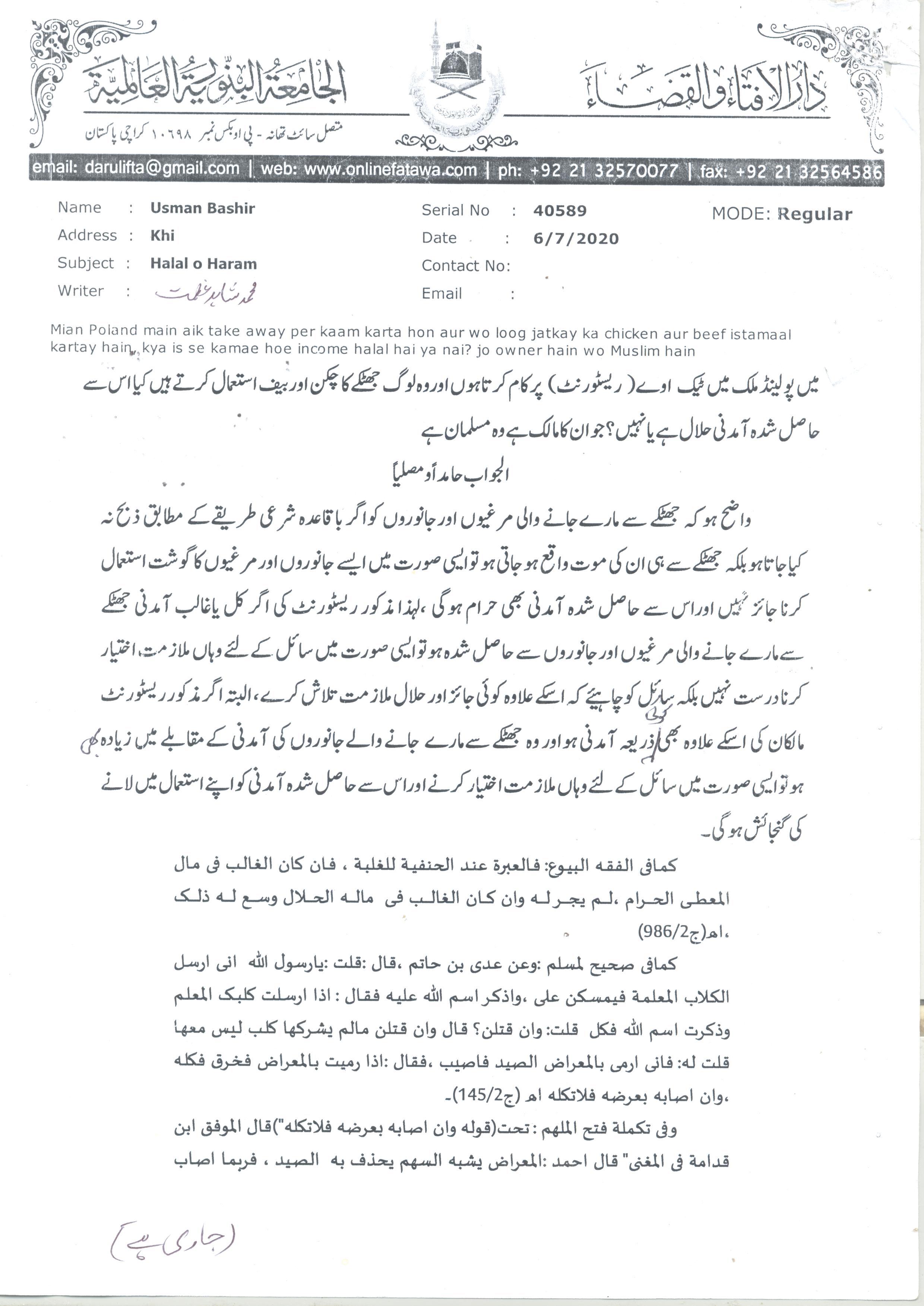 حرام کھانا فروخت کرنے والے غیرملکی ریسٹورنٹ کی ملازمت