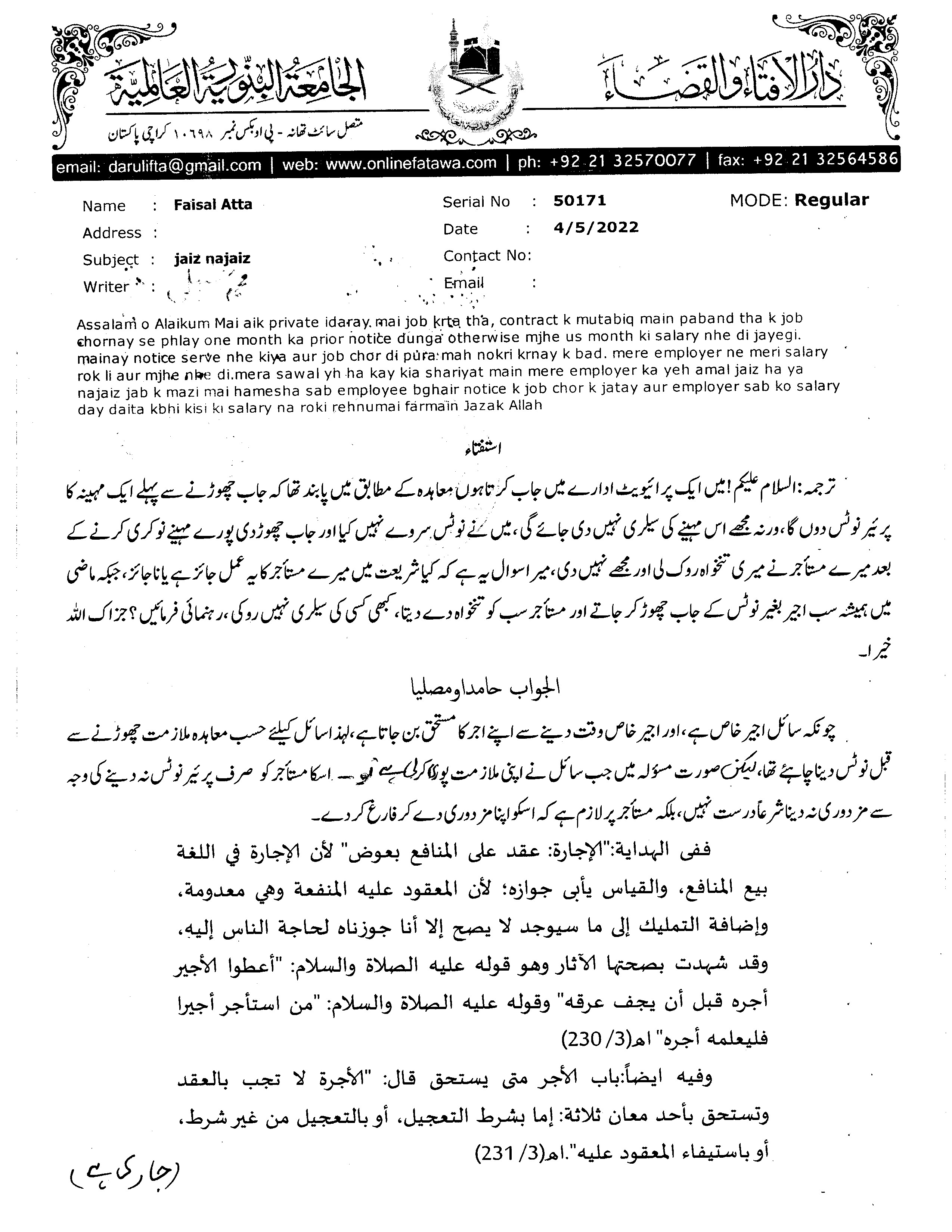 فتوی نمبر 50171کی تصدیق کریں