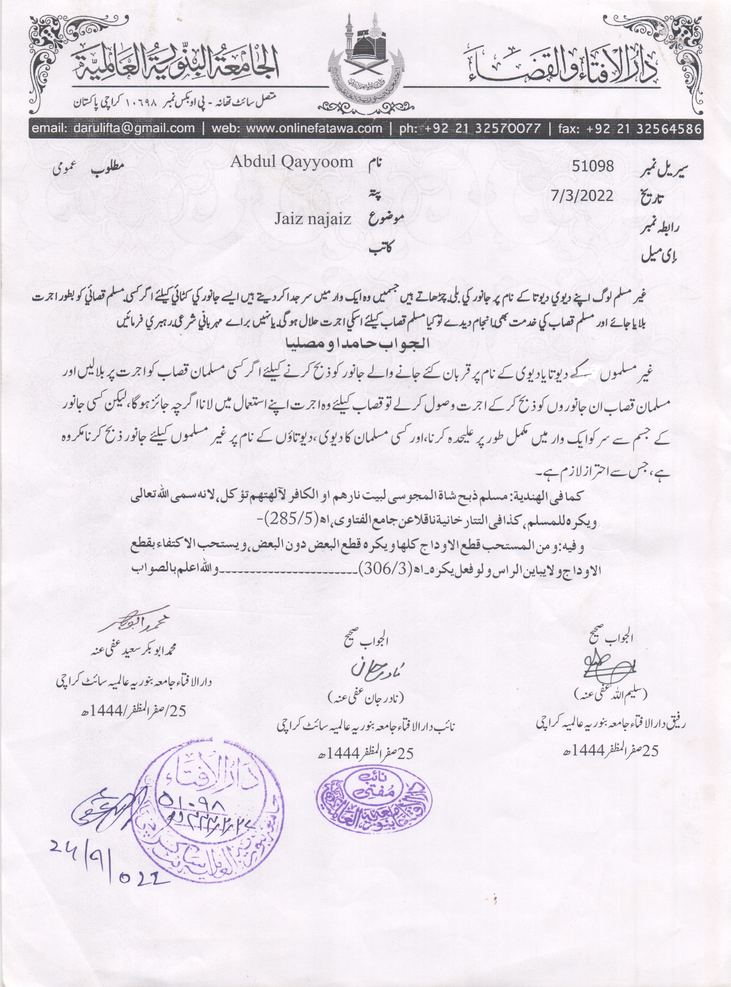 • مسلمان قصائی کا غیر مسلموں کے چڑھاوے والے جانور کو ایک وار میں ذبح کرکے اجرت لینا