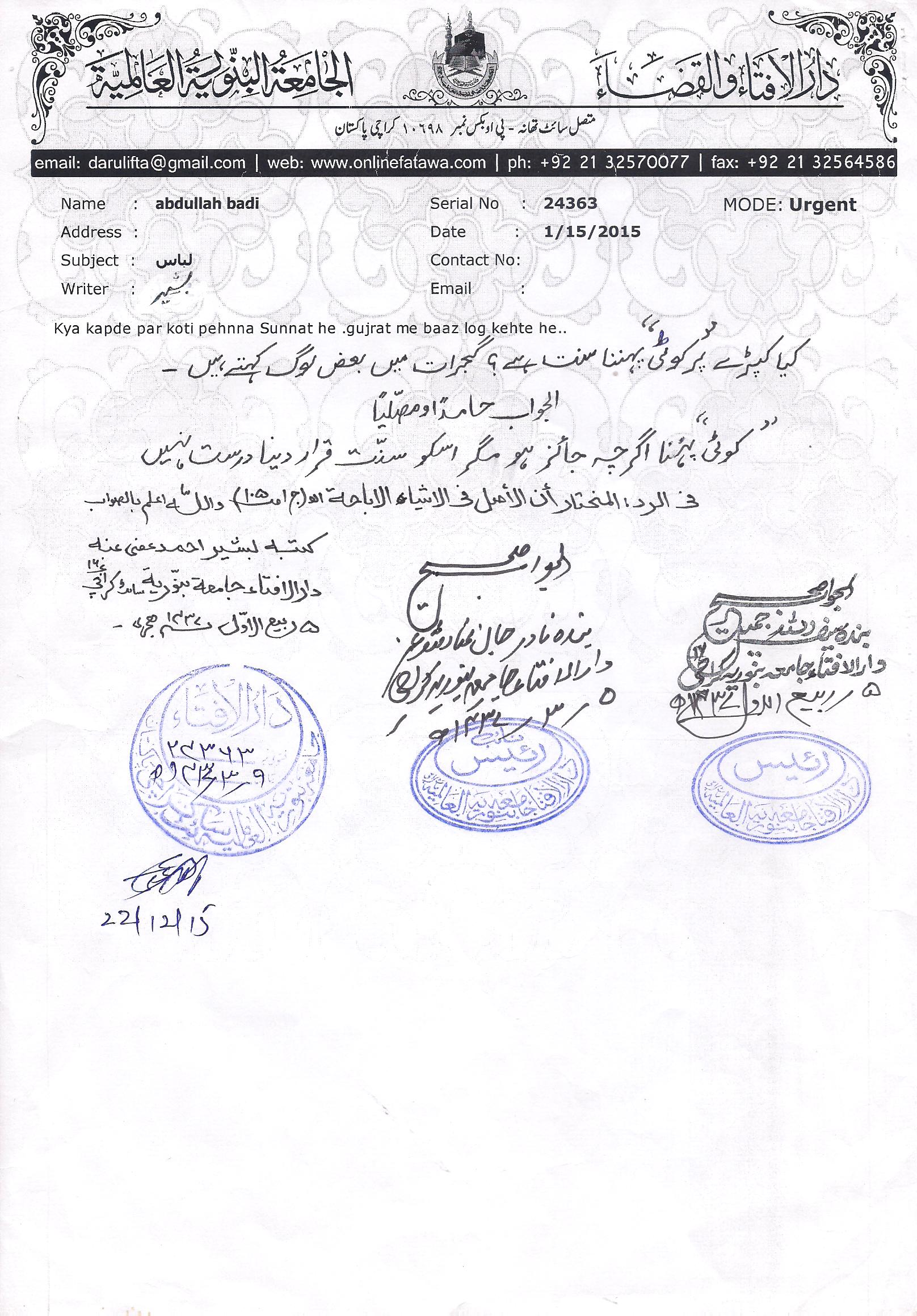 کیا کپڑے پر کوٹی پہننا سنت ہے