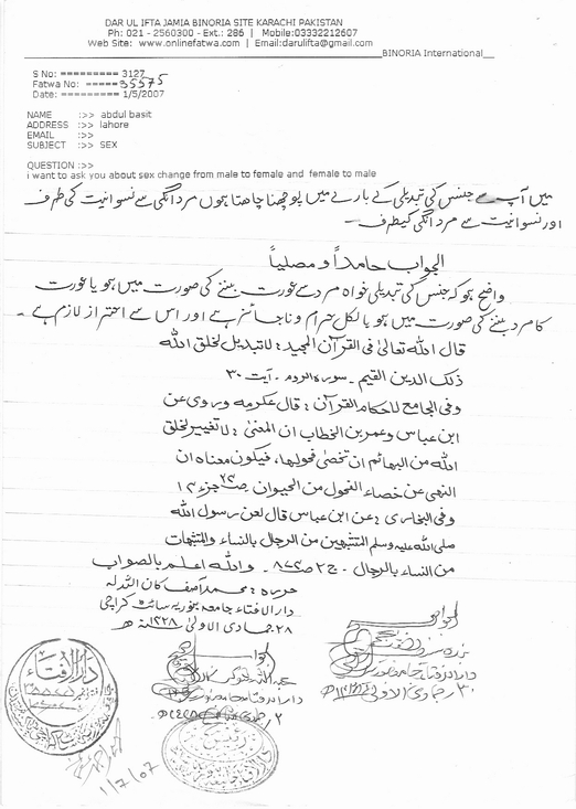 تبدیلی جنس کی شرعی حیثیت