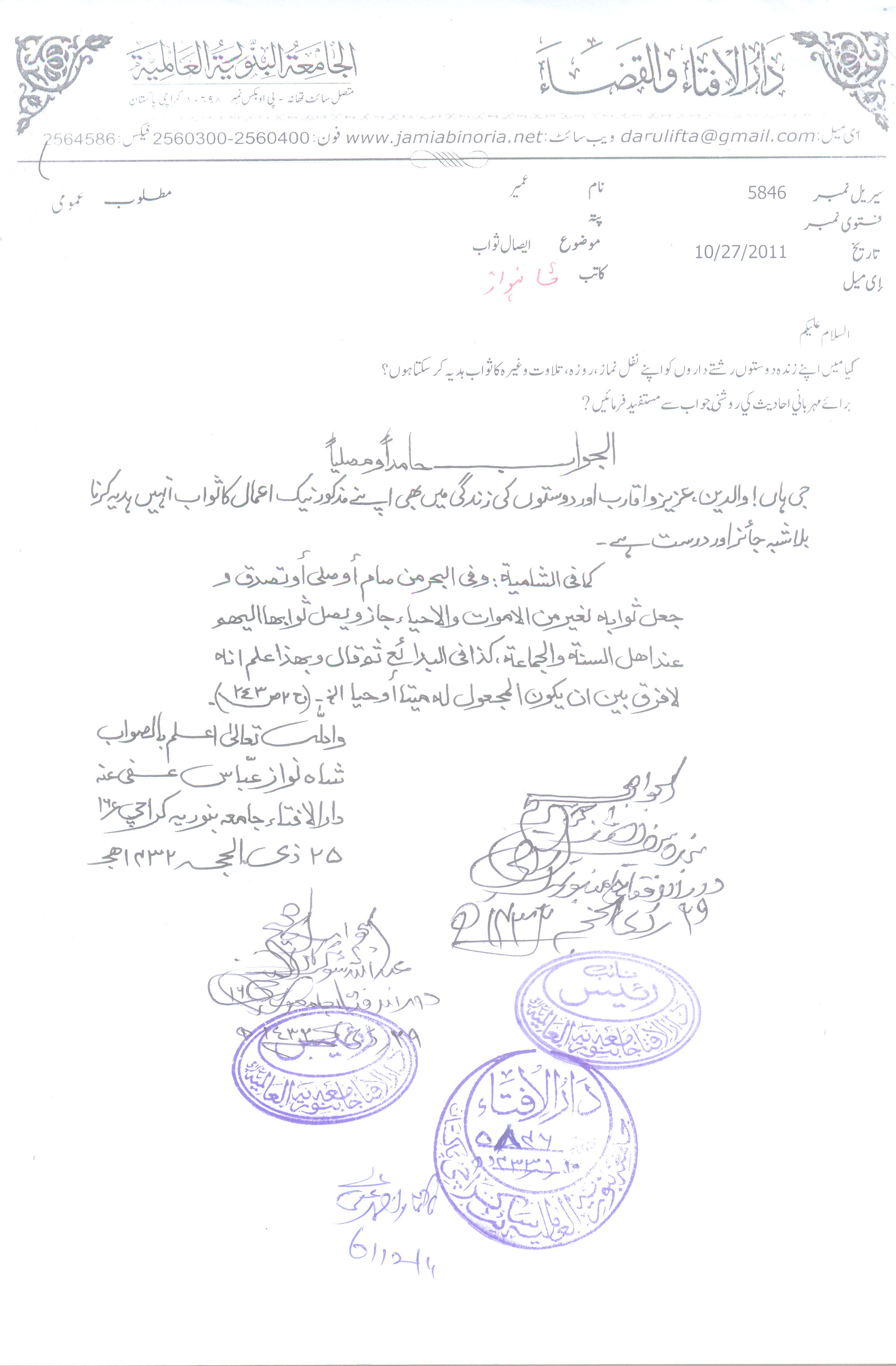 زندوں کو ثواب ہدیہ کرنا
